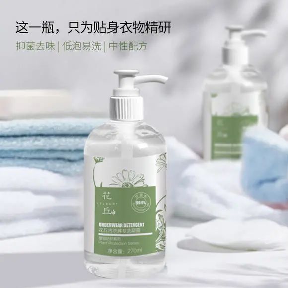 花丘·内衣裤专洗凝露采用草本植萃配方,轻松去血渍,洁净无残留。