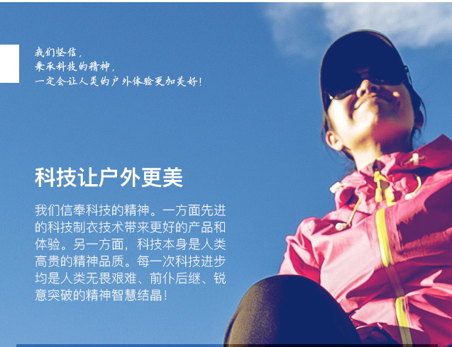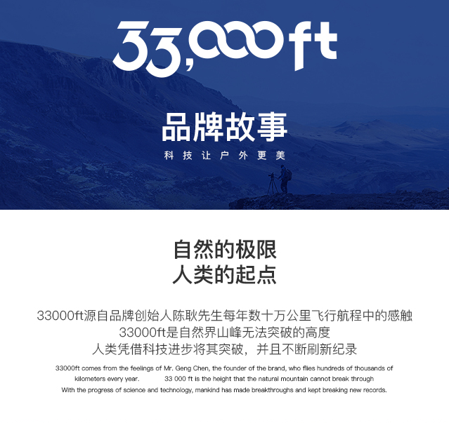 33000ft户外服饰品牌,秉承科技制衣的理念,锐意钻研,以科技为助力,专注于服装面料、工艺、款式的创新研发,为日益普及的户外生活方式提供舒适、美观的功能性衣着,优化户外体验。