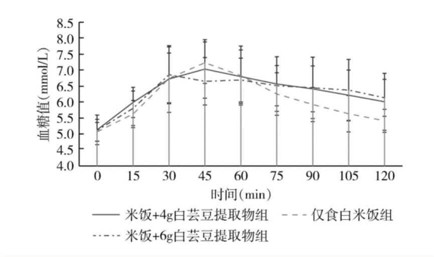 3组的餐后血糖峰值均出现在45~60min,达到约7mmol/L。与仅食白米饭组比较,米饭+4、+6g白芸豆提取物组的血糖平均值都在45min~60min时显著降低。