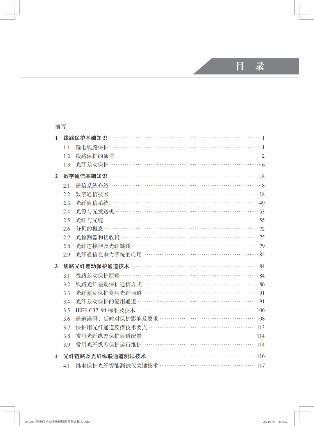 本书详细讲解了线路保护及数字通信的技术知识,如线路保护通道、通信系统、数字编码与调制等技术,着重介绍了光纤通信系统的构成、分类、特性、参数以及相关基本工作原理;阐述了光纤通信在电力系统中的应用,重点讲解了光纤差动保护技术的工作原理、通信方式、通道误码、延时对保护的影响及要求;介绍了主流光纤链路及光纤通道的测试技术,包括继电保护光纤智能测试仪、光纤链路智能在线监测设备的功能和应用等情况;重点论述了差动保护光纤通道检测技术,包括光纤通道检测项目、核心指标、检测仪器、检测方法、调试步骤以及常见问题。