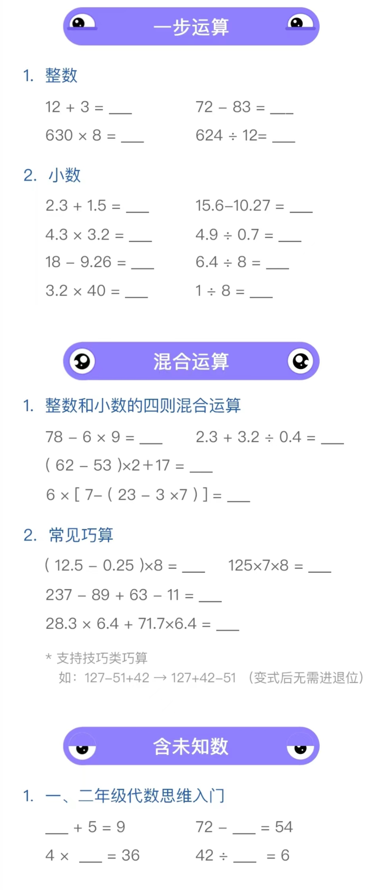 口算练习也是按照年级知识点拆分,不同年级的难度标准一一对应,比如学龄前是较为简单的20以内简单加减法,一年级开始会升级到拆数凑数连加连减,二年级开始学习进位退位和简单的乘除.......