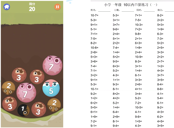 感受一下,同样的运算题,同样的知识点,左边是消除游戏,右边是常见的口算练习,孩子更愿意做哪个呢?