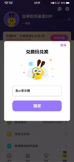 特地为鱼圈家长申请了三天的VIP体验,请家长下载数感星球,登录后点击右下角“我的”,再点击“兑换码”,输入口令:鱼sir家长圈,就能免费获取啦!