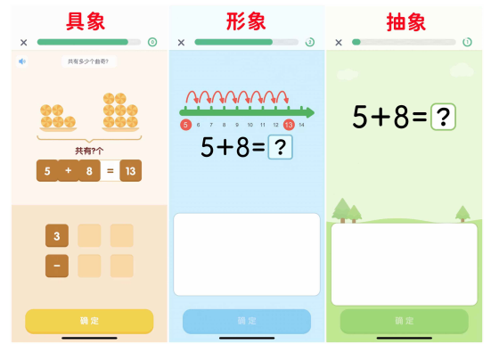 再比如这道进位加法题,可以算是孩子算术的一个坎,使用具象-形象-抽象的进阶练习方式,循序渐进,不用家长教,孩子就能内化进位加法的内容。