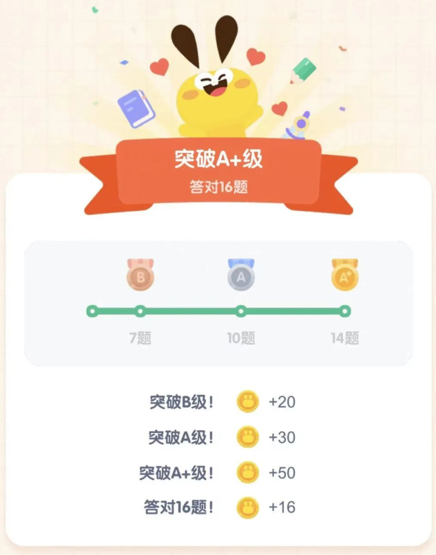 每次挑战60s,看着进度条越来越短,紧迫感也越来越强烈。在时限内答出不同的题,会获得不同的虚拟勋章奖励,如果做到了A+的评级,就说明孩子的口算能力很不错哦~