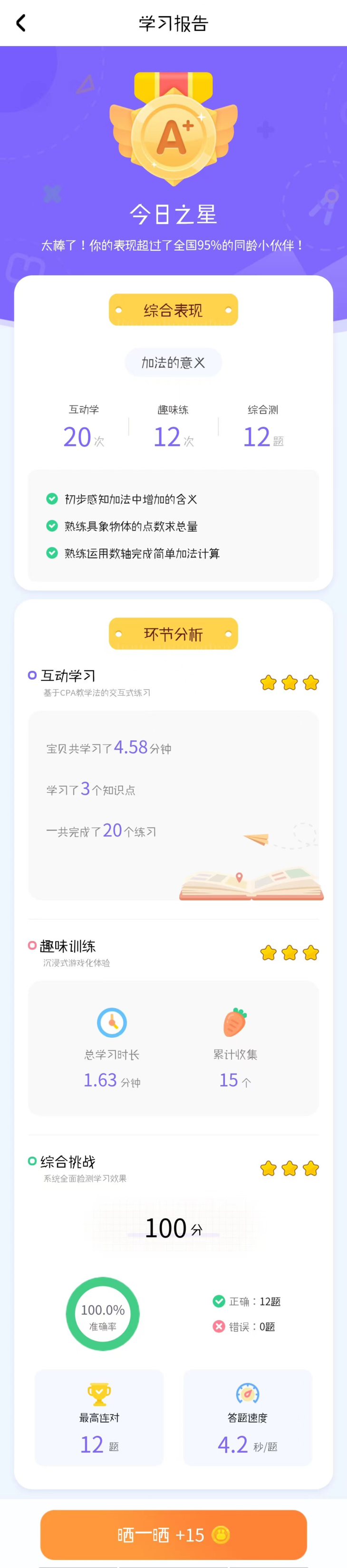 最后还有评的环节“学习报告”,不用跟着孩子学,就能知道孩子的学习情况。