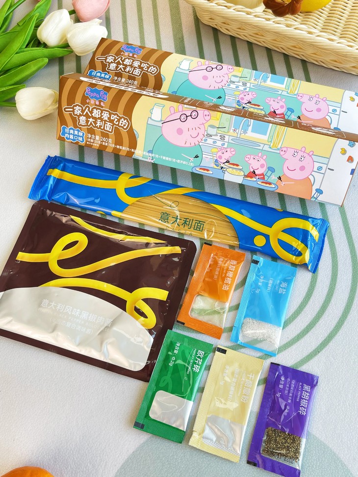 ✅ 精美包装:小猪佩奇联名的高级盒装好看又有趣;产品信息、制作步骤也可以随时看,简单三步即享意面大餐