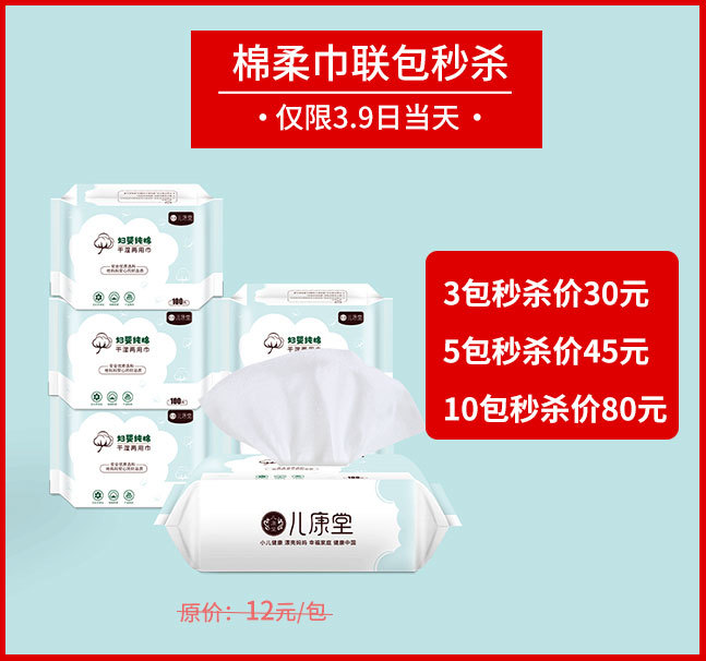 仅限3.9日当天,原价12元/包的棉柔巾,三包秒杀价30元,五包秒杀价45元,十包80元。