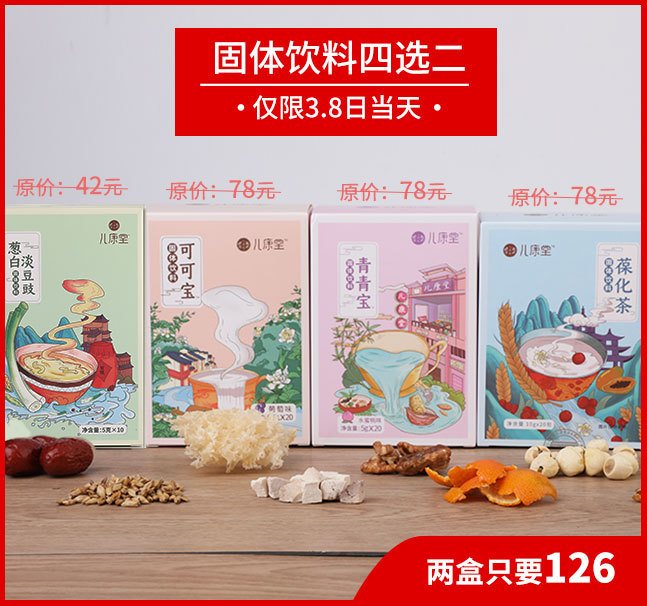 仅限3.8日当天,葱白、可可宝、葆化茶、青青宝四款固体饮料任你选,两盒只要126元。