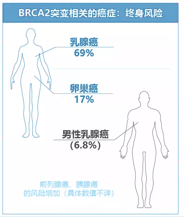 携带BRCA1/2基因突变的女性不仅乳腺癌发病风险增加,其他如卵巢癌、输卵管癌、胰腺癌、胃肠癌及黑素瘤等发病风险也增加,男性罹患乳腺癌、前列腺癌风险增加。