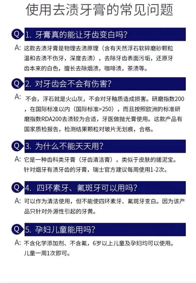 这个牙膏就是很多国外医院、国内私立医院用于抛光的抛光剂,内含有许多细小的天然火山浮石颗粒,有了神奇的去渍功效。一周1-2次适当使用,不会破坏牙釉质。