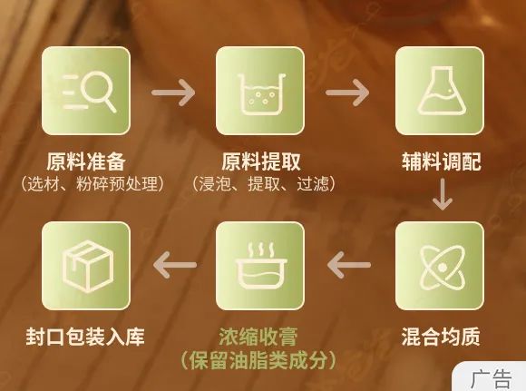 七仁润润畅通膏的熬膏技艺,在传统工艺的基础上,精选药食同源道地食材,经过六大工序,对原料进行清洗、干燥、粉碎等处理、再浸泡,使药材中的有效成分充分溶出、采用煎煮法提取出原料中的有效成分、将提取液进行过滤,去除药渣。
