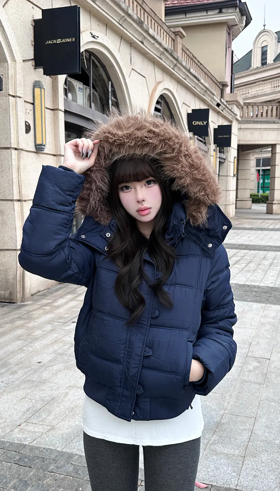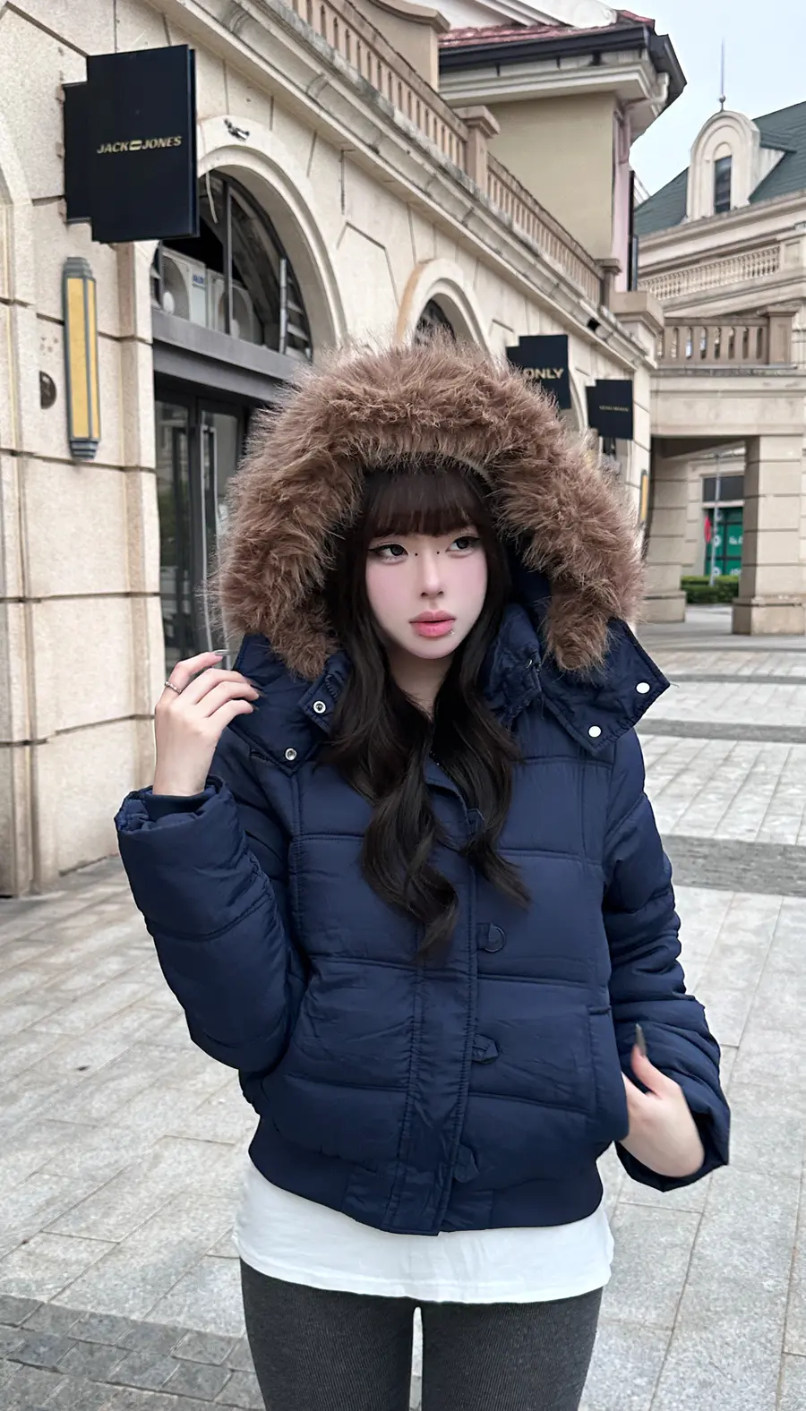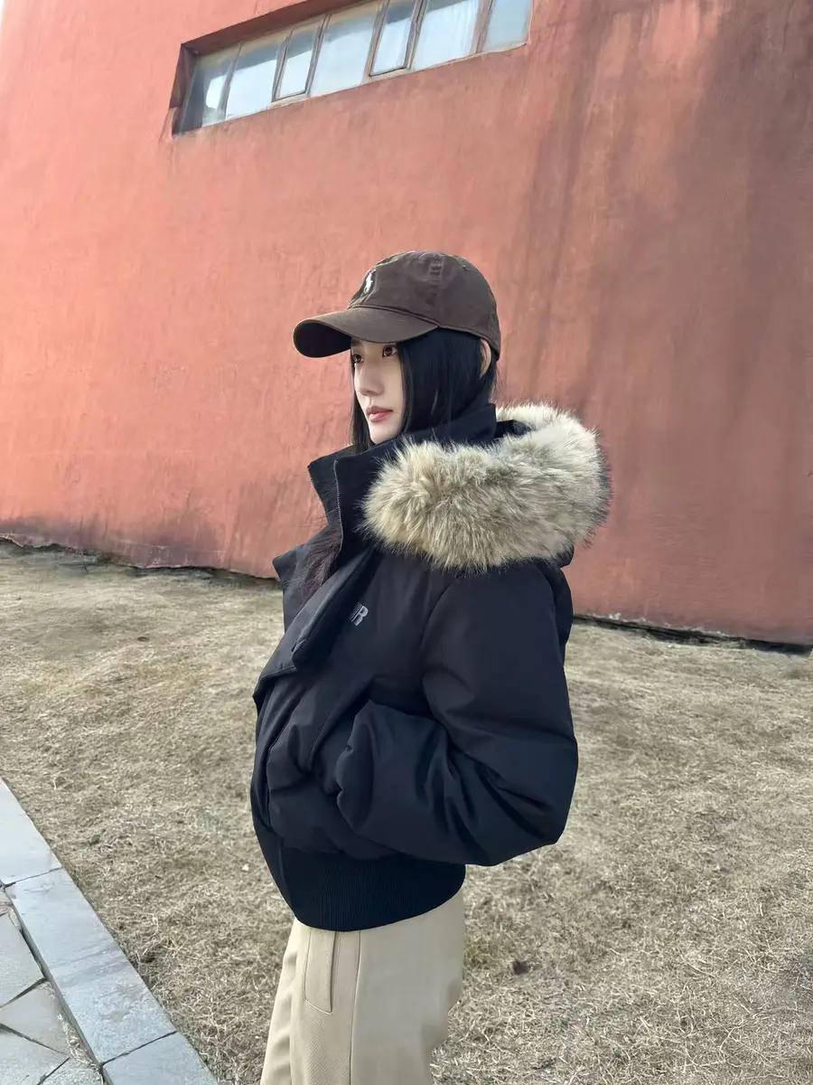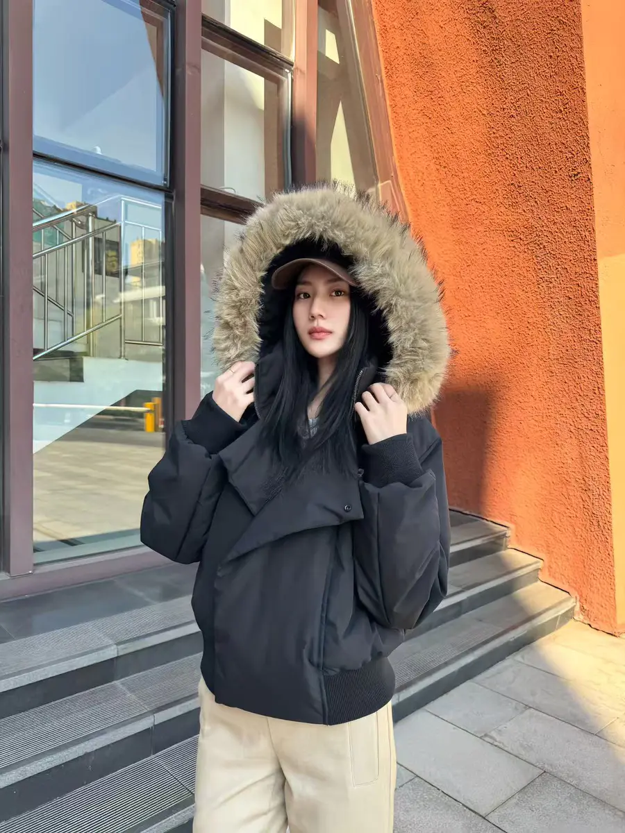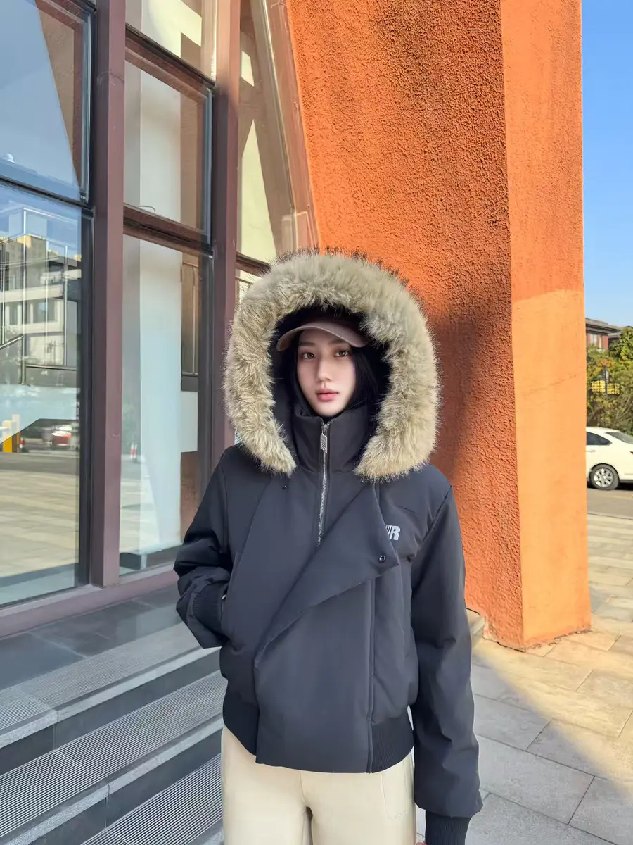 种草单品①:斜门襟短款毛领羽绒服