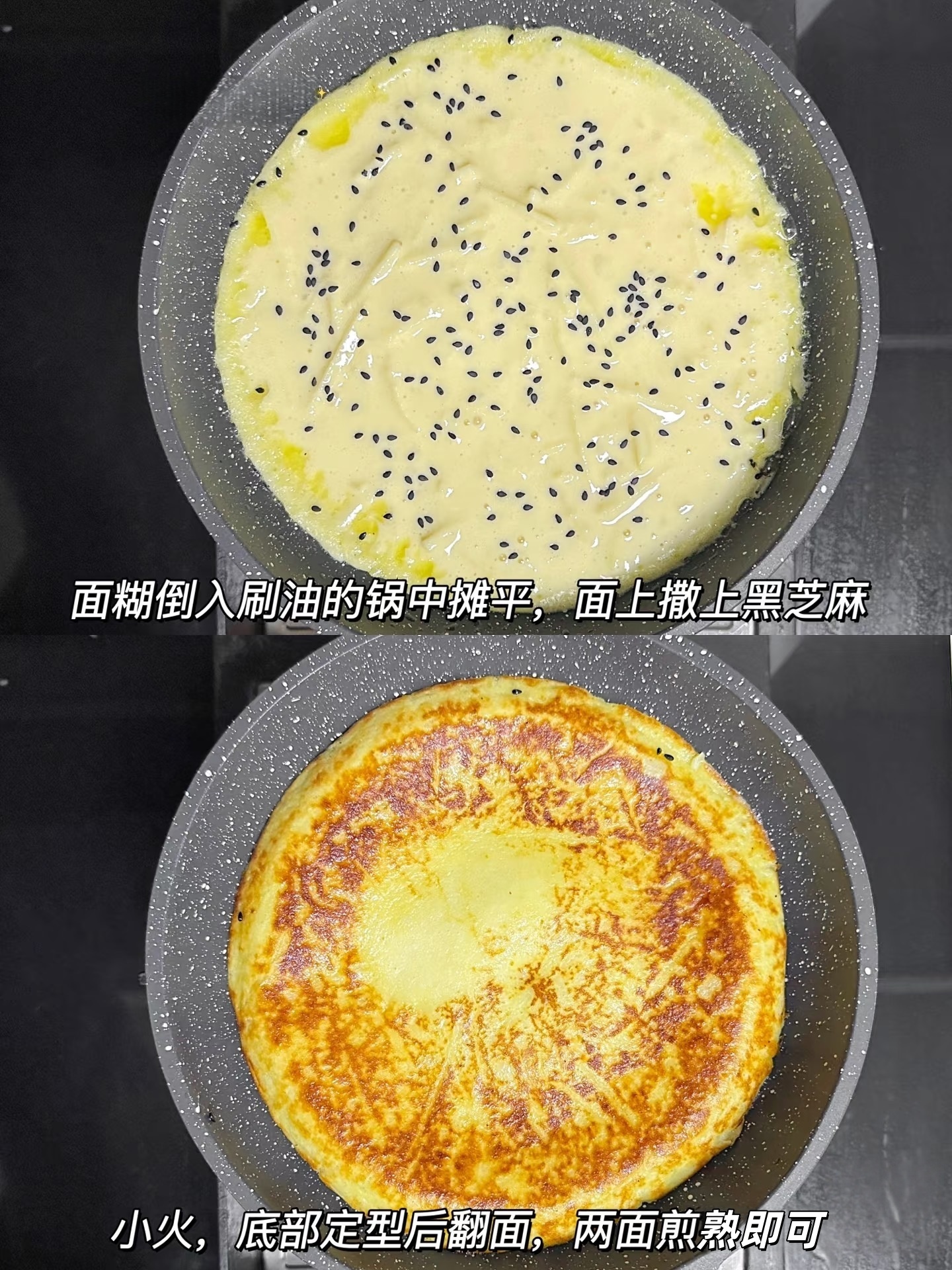 4.面糊倒入刷油的锅中摊平,面上撒上黑芝麻