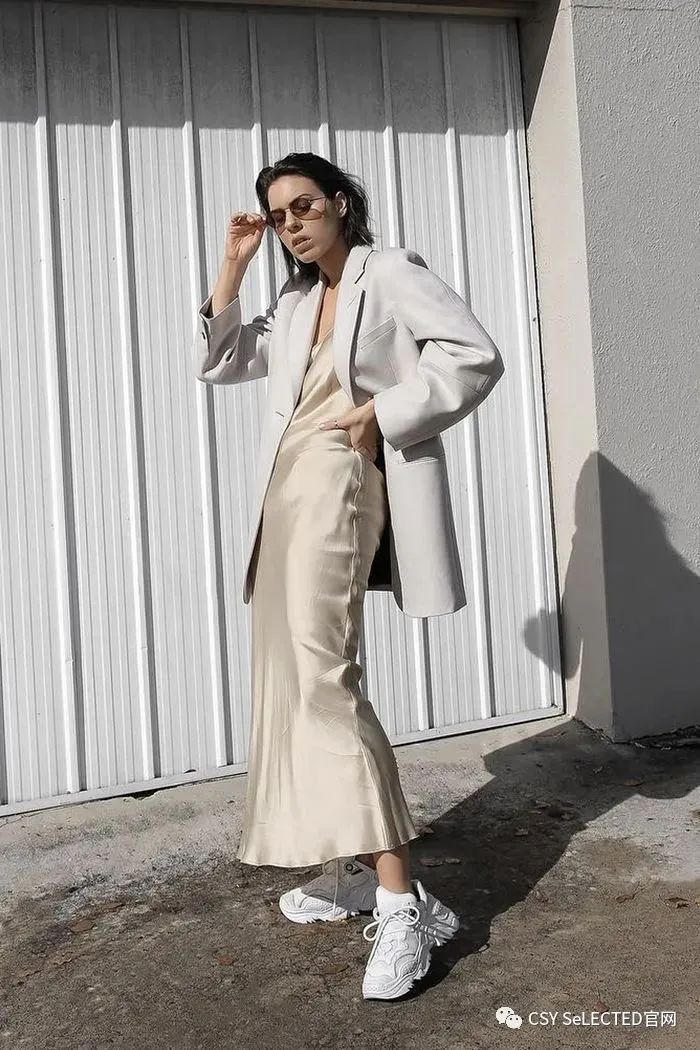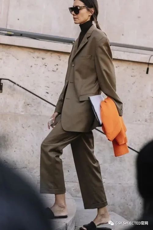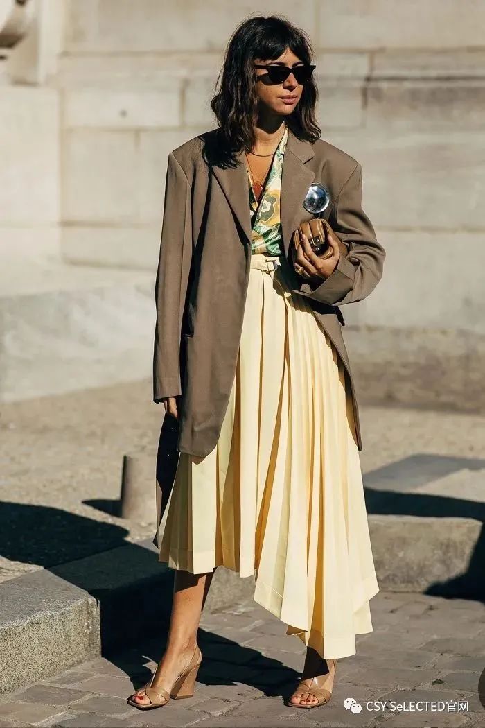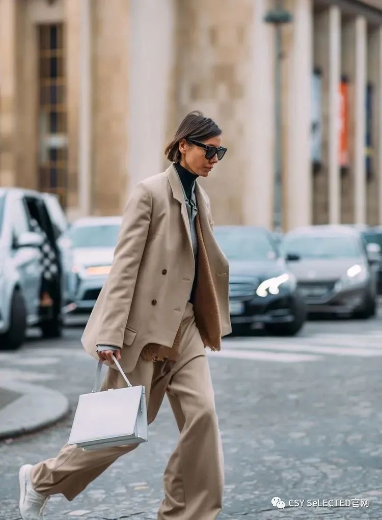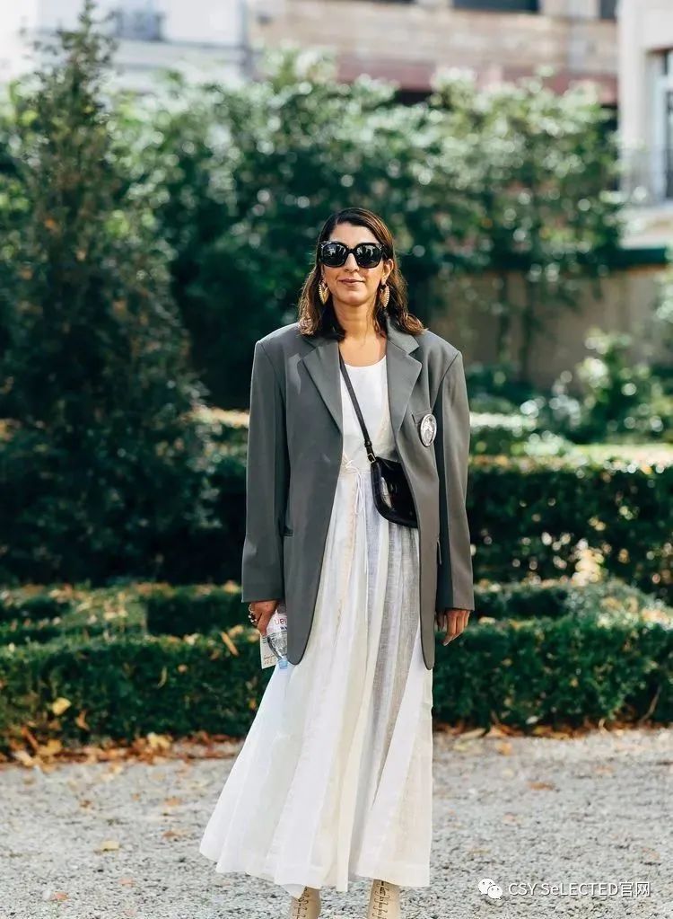 西装外套也是这几年在时尚圈中出镜率非常高的单品之一,在选款的时候,一定要注意把控好面料的质感,主要以硬挺版型的单品为主。这一类的面料对身材的包容度会更高,同时作为外套来搭配的话,也需要注意把控搭配度,太过软塌的面料很容易显得臃肿拖沓。