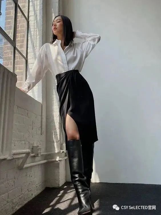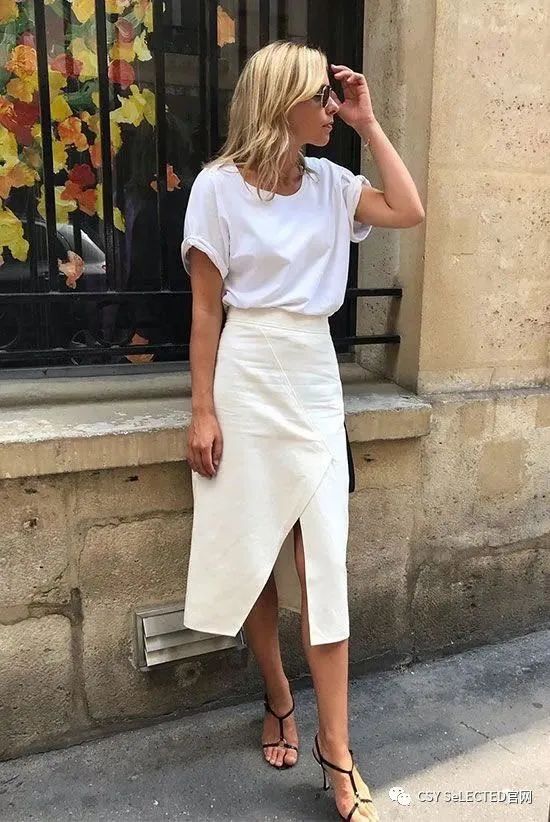 T恤+开衩裙。经典黑白T恤,平衡开衩裙的性感妖娆,兼具帅气和柔美,大写的高级美。