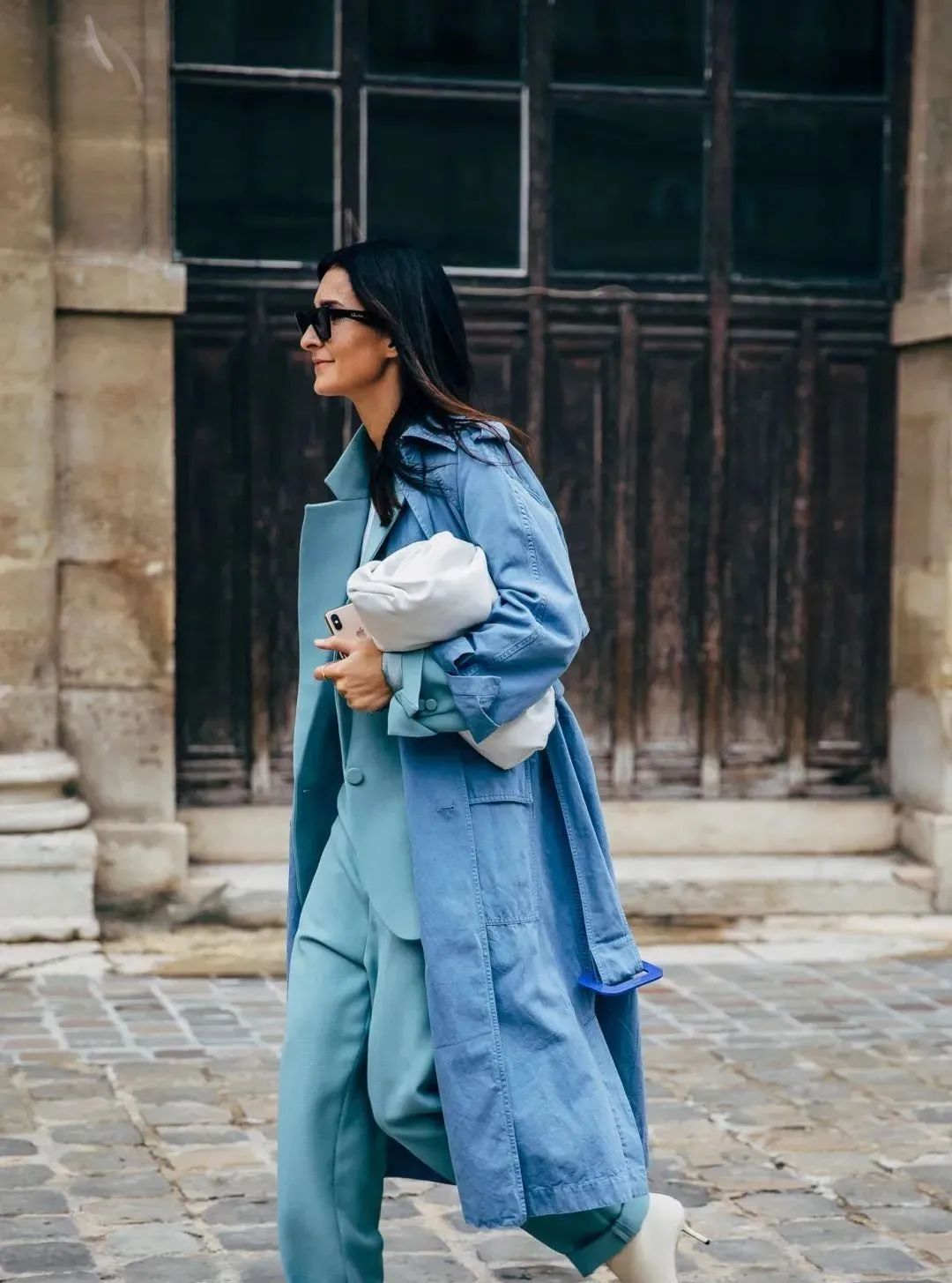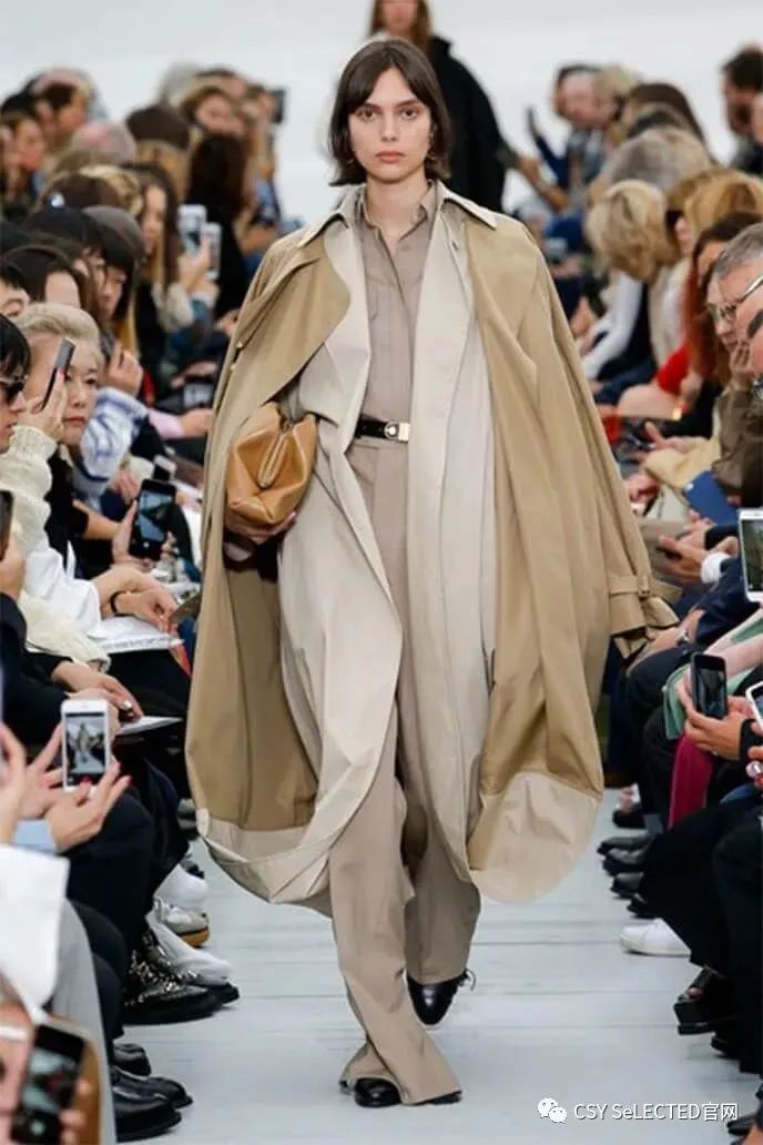 风衣单品大多数都会比较长,所以在搭配的时候为了避开拖沓感,一定要遵循宽窄结合的搭配原则,只有这样,才能打造出优越的身材比例,穿出“纸片人”既视感。