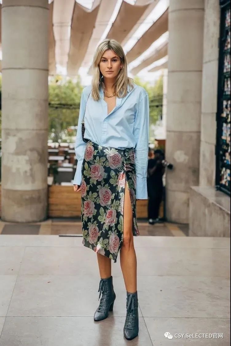 用大衬衫的建筑感轮廓,和曼妙的开衩裙搭配,是高级大气的大女人气质。这时候的开衩再高,都不会有艳俗感。但要注意贴合身形的开衩裙,更适合娇小身材。