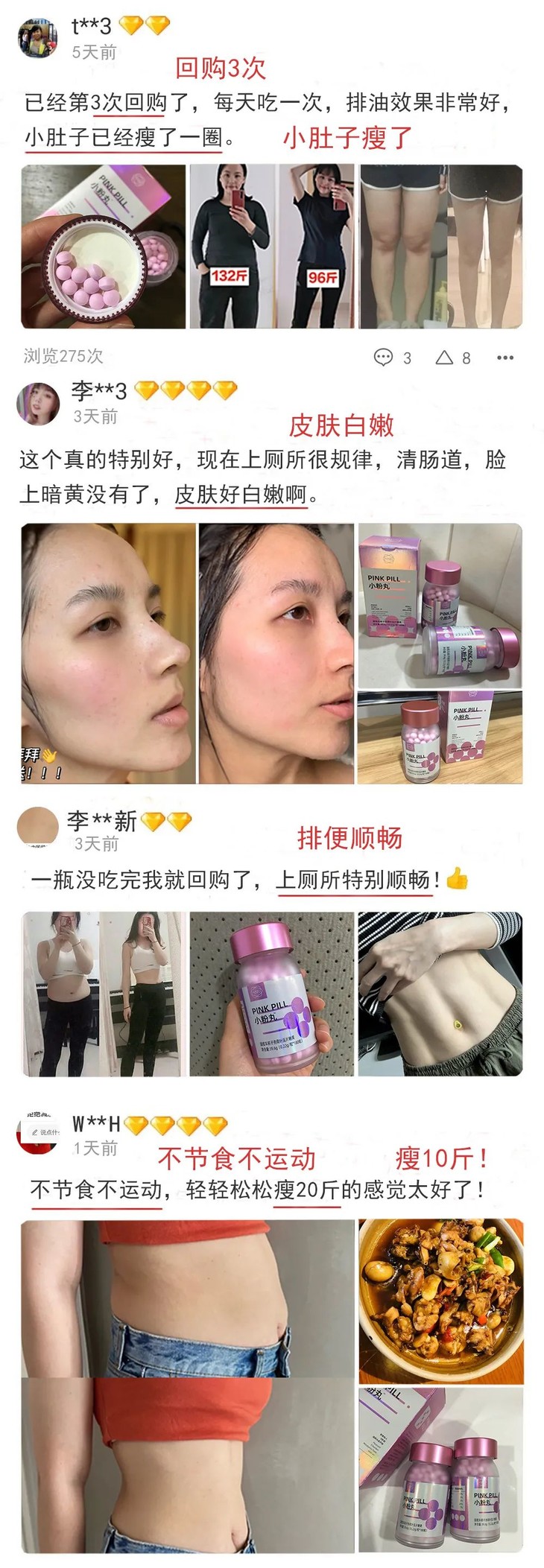 @小美丽:吃小粉丸本来只想减肥,没想到皮肤也跟着变好了!感觉脸蛋“嘭”的一下饱满了,老痘印、小细纹、大毛孔全都不见了,摸起来比剥了壳的鸡蛋还滑嫩!
