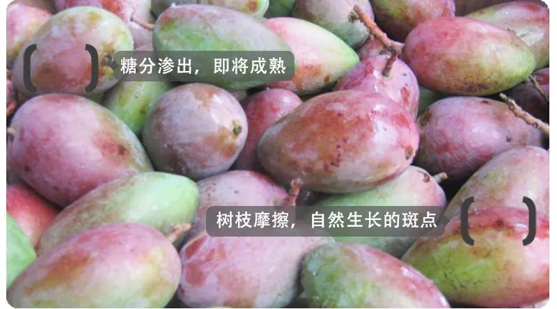 芒果在生长的过程中,会有少量自然斑点,属正常现象,在成熟的过程中,表面以及果蒂处会有果糖渗出