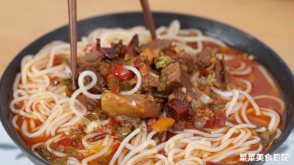 在牛骨高汤中加入番茄一起熬制,逼出了牛腩的鲜味,和劲道的米粉一起吸入,一口大满足!
