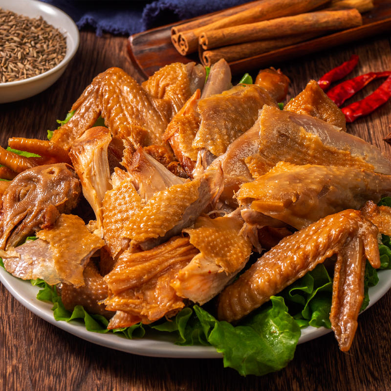 经20多天自然风干后,用花椒、肉桂、芝麻、孜然、辣椒等十几种香料卤制,让酱汁完全浸入鸡肉里。