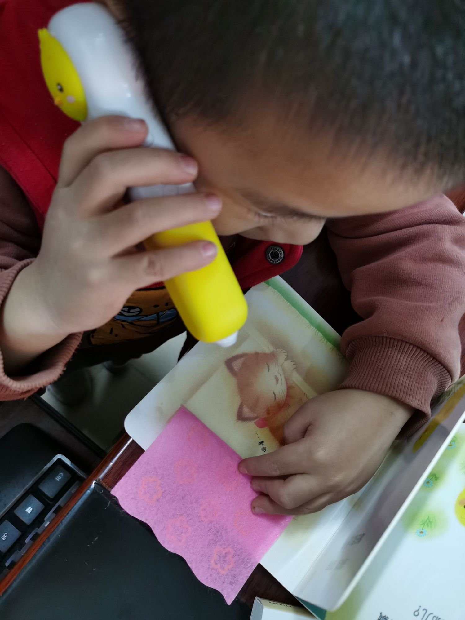 跟着我去上班的孩子,只能自己找点事做,于是给了他们点读笔,兄弟俩时不时的就点读一番,还特意把点读笔放到了耳边听起来。