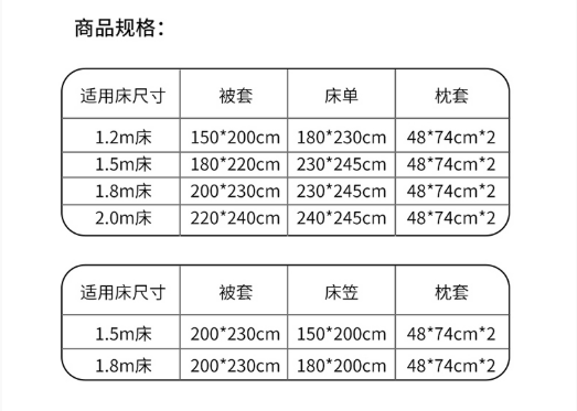 多种尺寸,还有三件套、四件套、床笠款的搭配可供选择,1.2m、1.5m、1.8m、2m的床都适用。