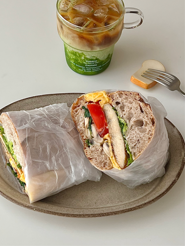 3️⃣恰巴塔面包先放上炒熟口蘑菠菜,再摆上切片的番茄和滑蛋,盖上一片芝士片,最后放上煎熟的鸡排盖上另一半恰巴塔面包,包紧保鲜膜对半切开