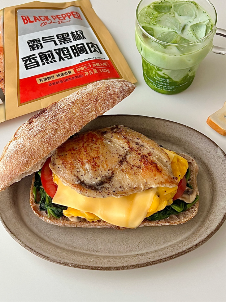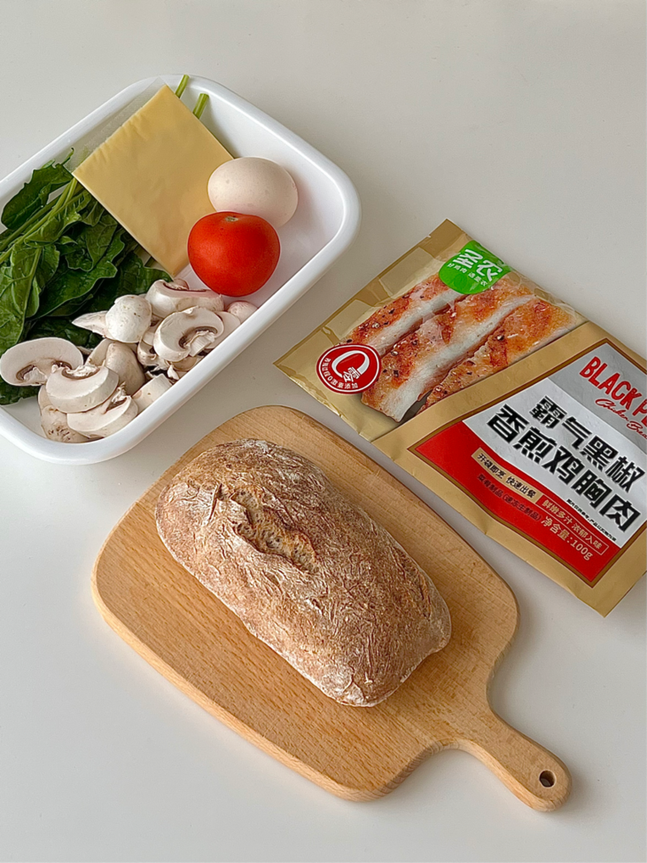 👉🏻黑麦恰巴塔|圣农黑椒鸡胸肉|鸡蛋|菠菜|口蘑|芝士片|番茄