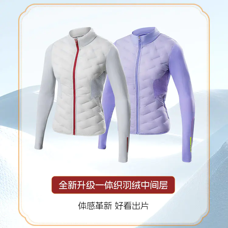 “一体织拼接羽绒”在核心区给你稳稳的温暖,腋下+后背用透气针织秒排湿汗,运动出汗后背也清清爽爽~