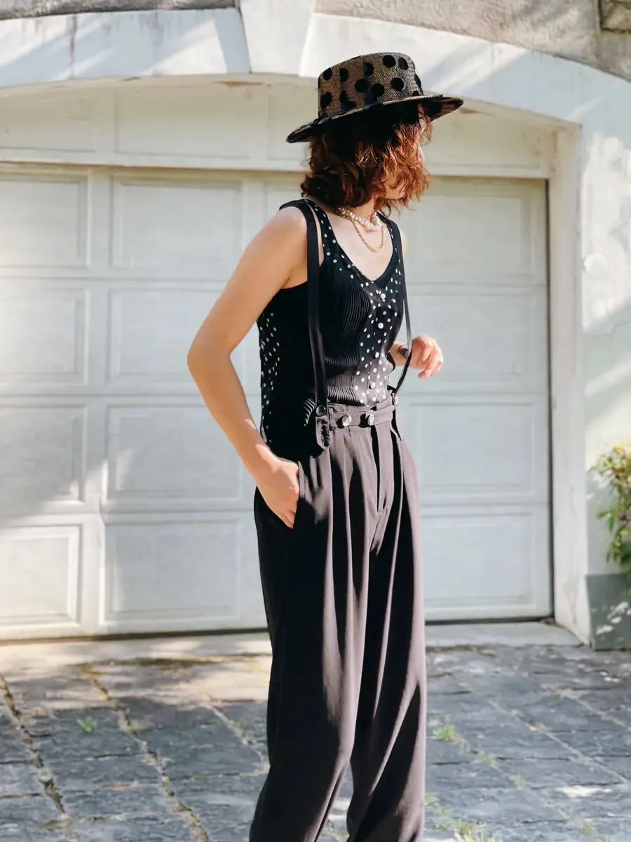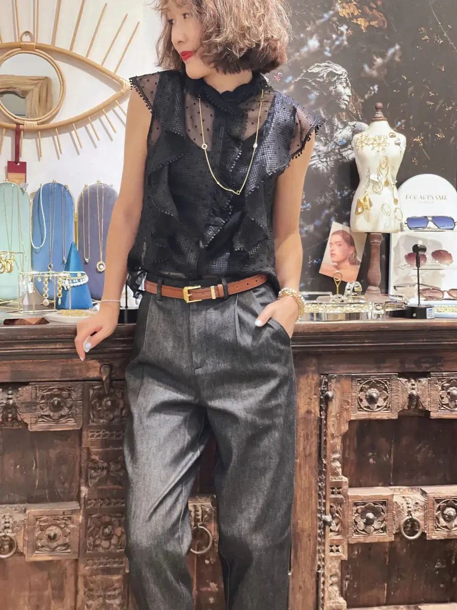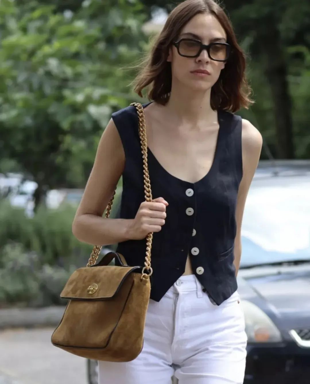 黑色top配搭牛仔单品时,用同色手袋和鞋履作为辅助,恰到好处。