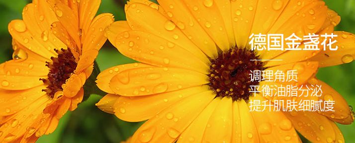 金盏花成分具有镇定肌肤,改善敏感性肤质,促进皮肤的新陈代谢的功效。尤其针对干燥的肌肤,有高度的滋润效果。此外,针对日晒所造成的红肿、发炎,金盏花也能加以舒缓和消炎,改善敏感性肤质,促进皮肤的新陈代谢,令肌肤回复健康澄净。