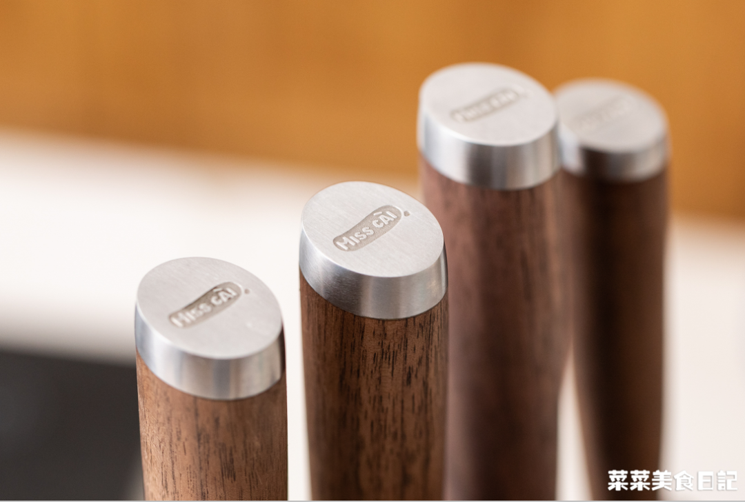 所以这次定制刀具,我们的logo还是放在刀柄尾部,用冲压的方式做了个miss cai的小小logo。