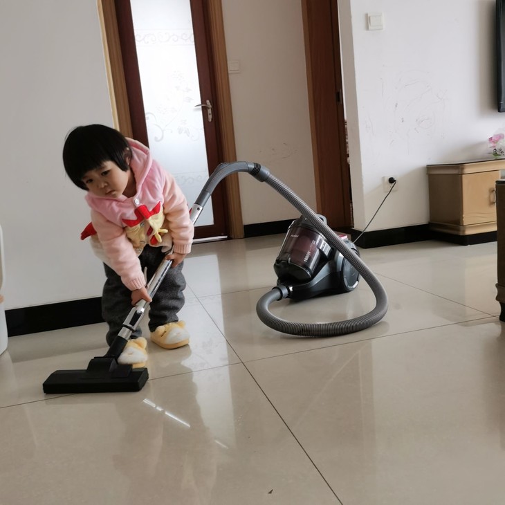 拿来吸尘器帮妈妈做事,插上电源吸尘器开始响了,小朋友吓得躲一边,过一会儿又慢慢移动过来轻轻摸一下,小声说“我不怕”