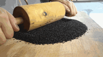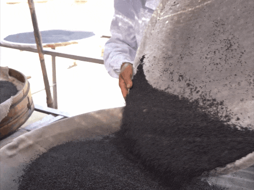 经过蒸晒后,五黑研磨成粉,研磨成不同粗细的颗粒后,再仔细混合,得到初步的料体。