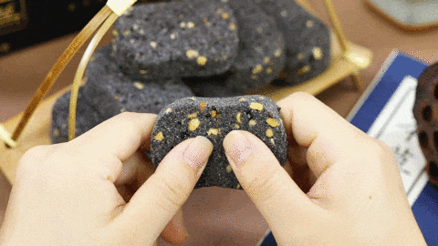刚出炉的五黑桑葚糕,混合着米香与各种果仁香,清新不腻,没有其他高糖油点心的油腻感。