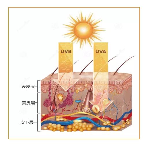 UVB穿透力弱,但能量强,损伤力大,作用在表皮层,导致皮肤晒伤、晒黑。在夏天、阳光直射时比较强烈。