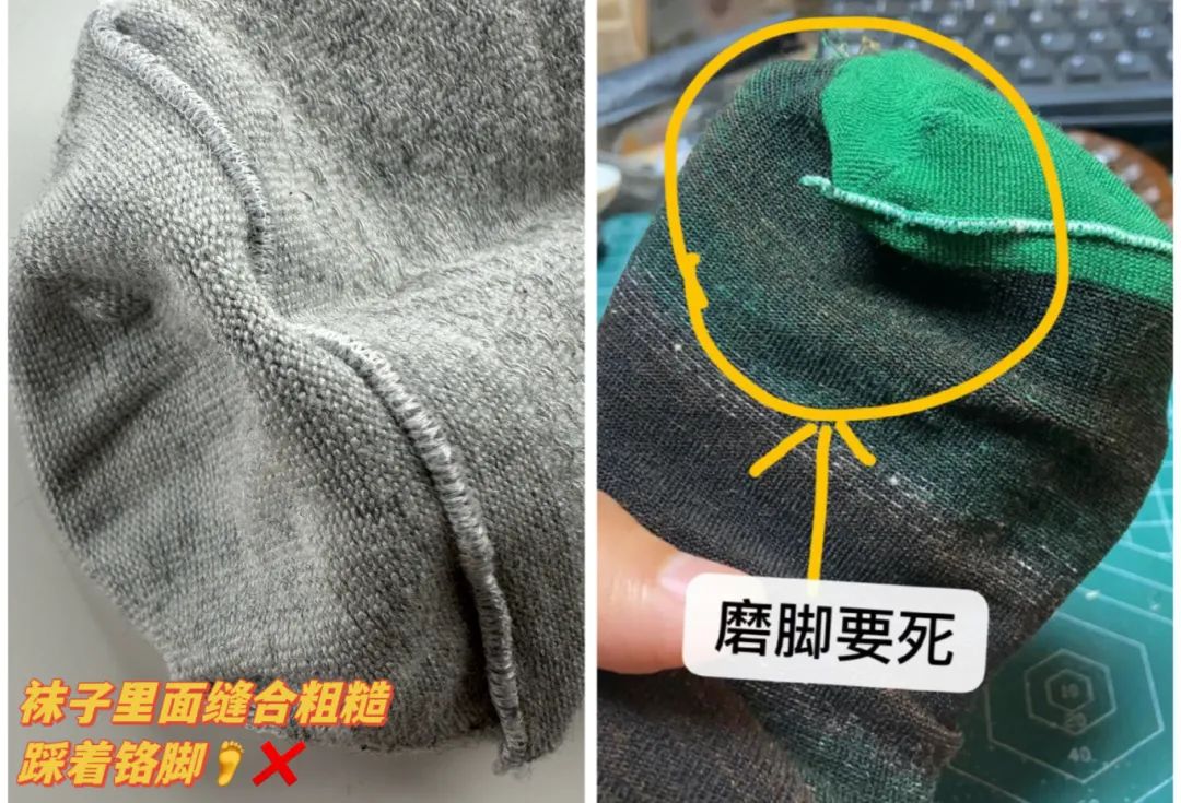 有的袜子穿在脚上,很容易被缝合处一些硬硬的“梗”磨得脚趾疼,甚至红肿。