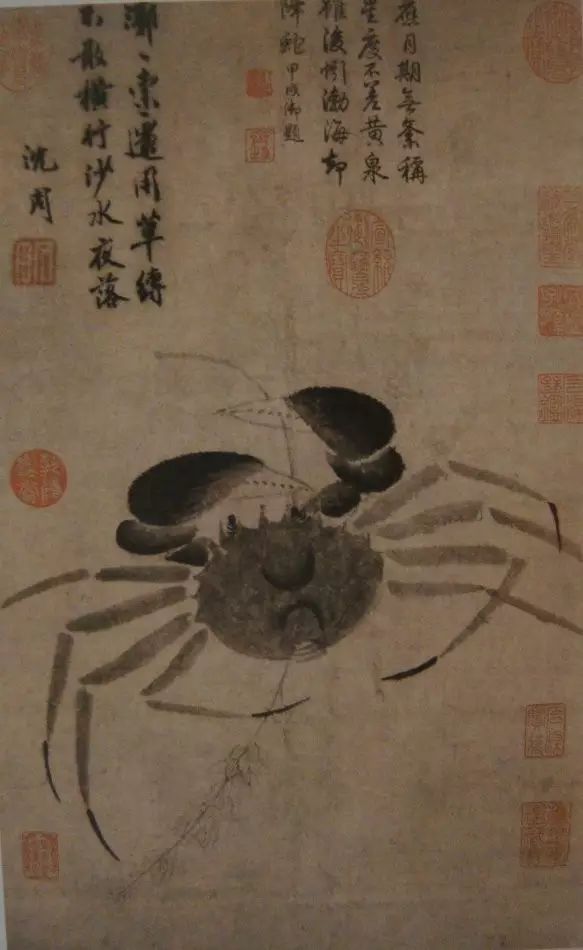 沈周活脱脱勾画出一只清水大闸蟹横行于水草之间的情景,将螃蟹狰狞而又可爱的形象,描绘得淋漓尽致,别有一番意境。