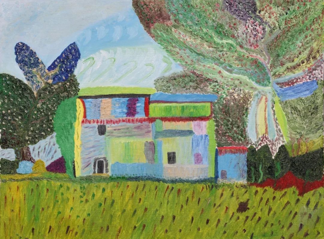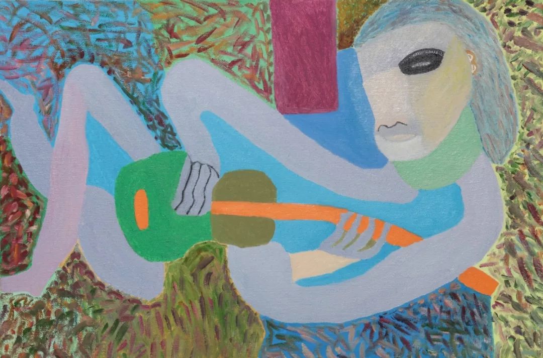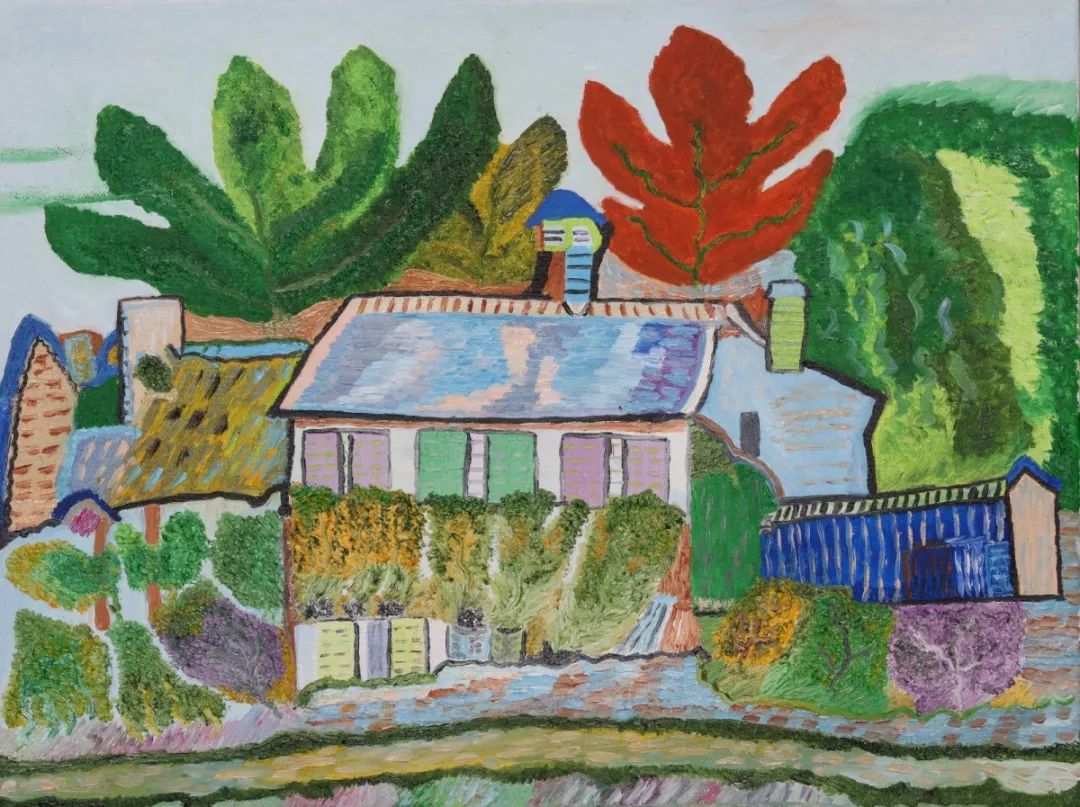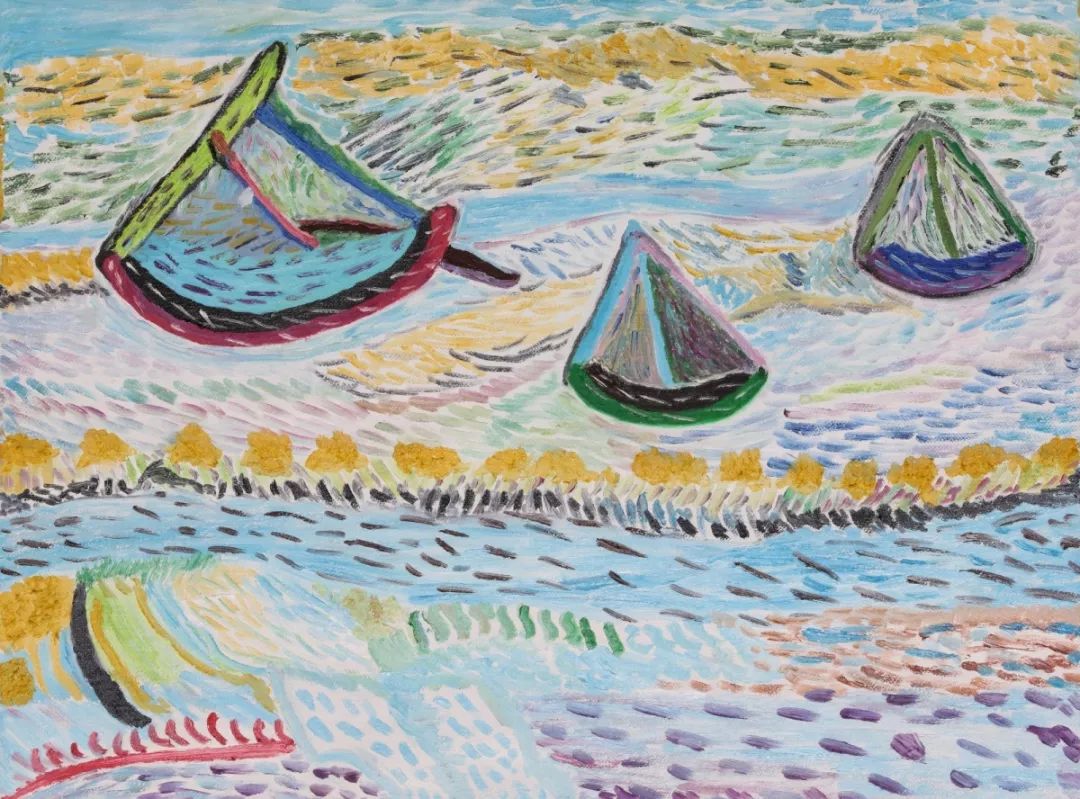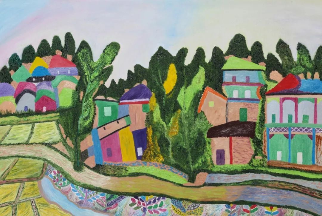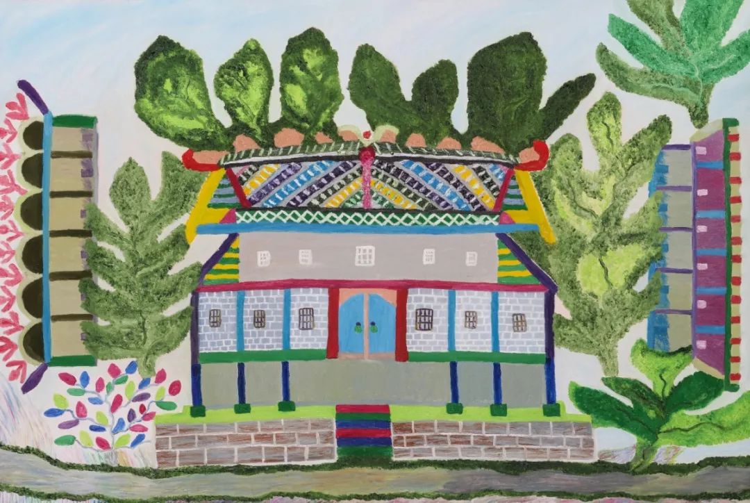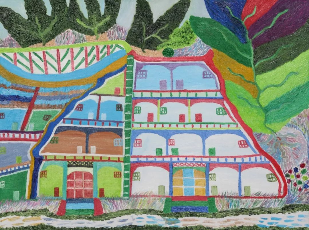 苏和珍的画,大块大块的色块,像织毯却又是蜡笔一样的笔触,奇特的线条,色彩丰富饱满,初看时会觉得很有少女的气质,像二十岁少女的娱心悦己之作,细看又不是,是好像一个人在阳光下捧腮发呆的冬日下午,独自坐着,也不知道在想些什么,有哀乐吗,似乎也没有,就是这样独自呆着的下午。