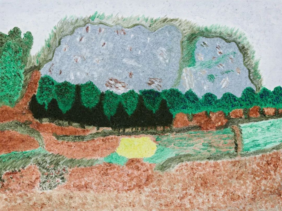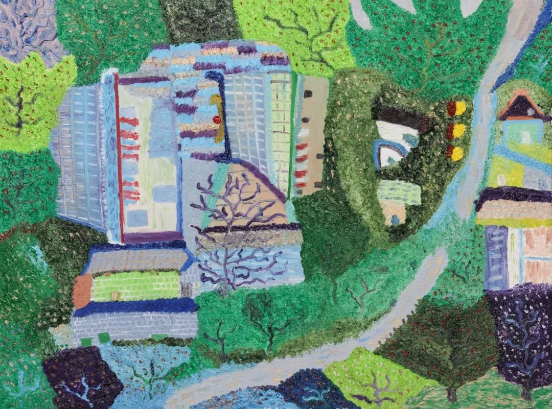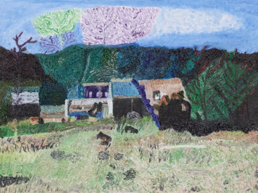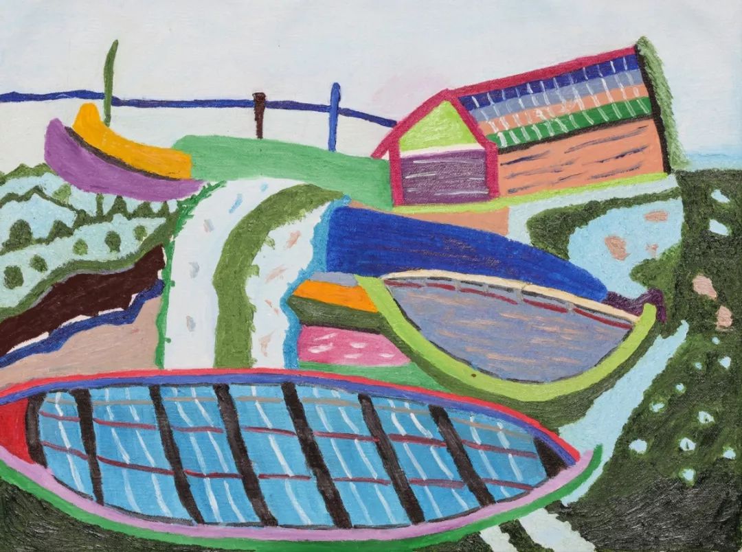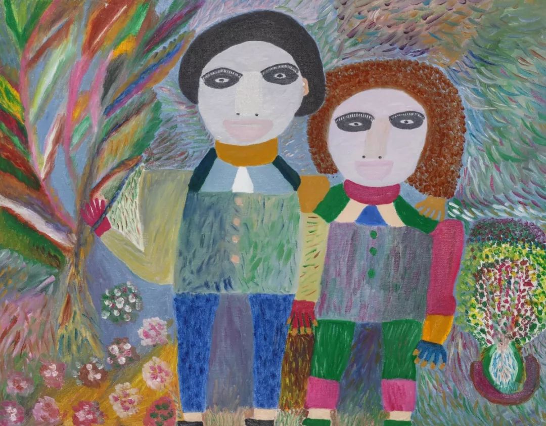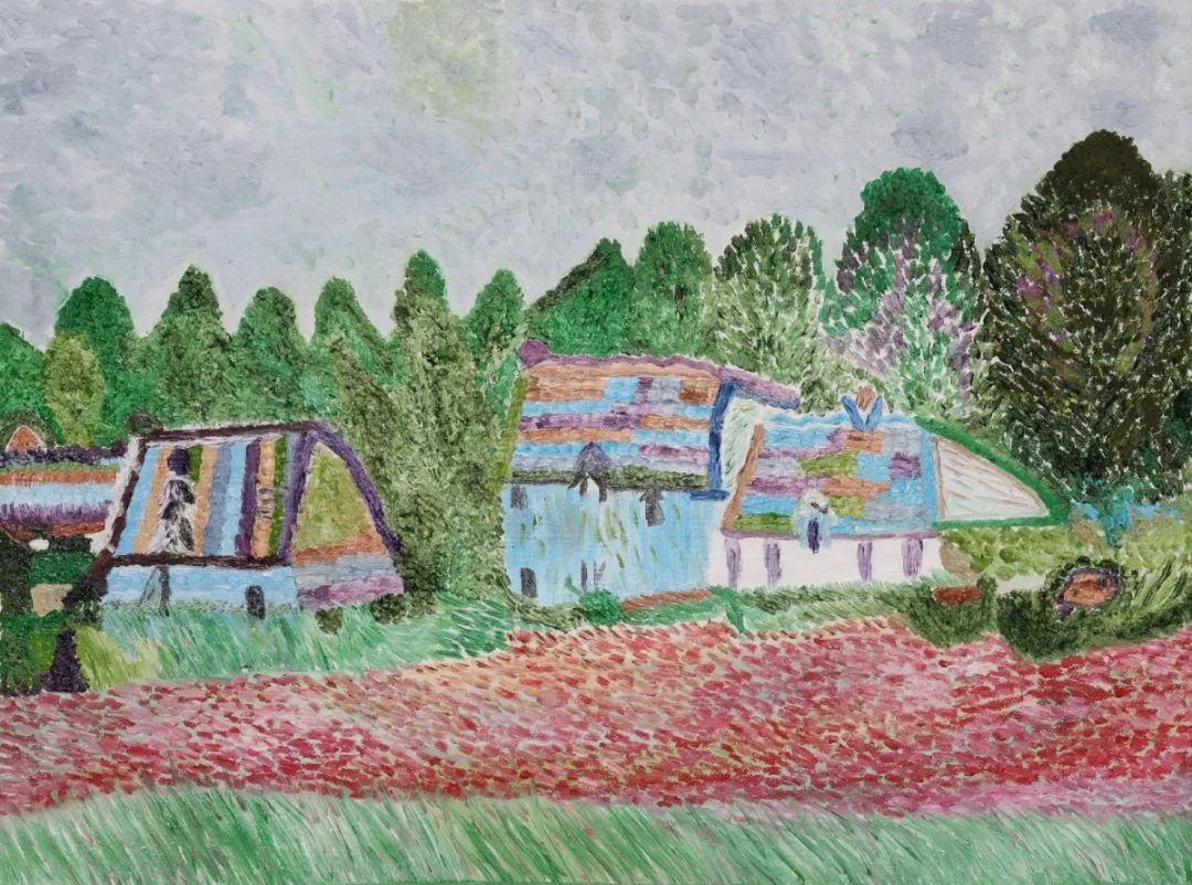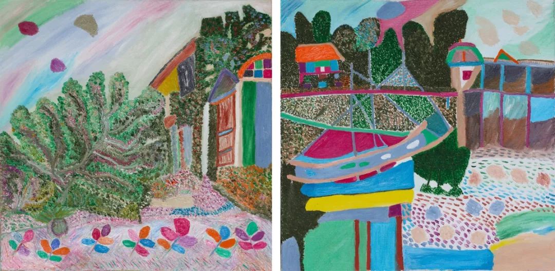 苏和珍的画,大块大块的色块,像织毯却又是蜡笔一样的笔触,奇特的线条,色彩丰富饱满,初看时会觉得很有少女的气质,像二十岁少女的娱心悦己之作,细看又不是,是好像一个人在阳光下捧腮发呆的冬日下午,独自坐着,也不知道在想些什么,有哀乐吗,似乎也没有,就是这样独自呆着的下午。