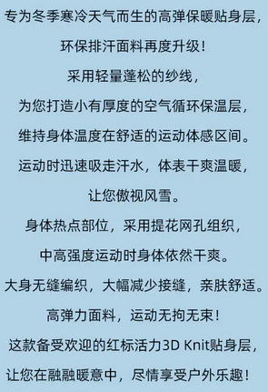 3D控温技术,通过3D编织,能够有效保证身体各个部分冷热均衡,即便面料没有这么厚,一样能实现动态保暖!