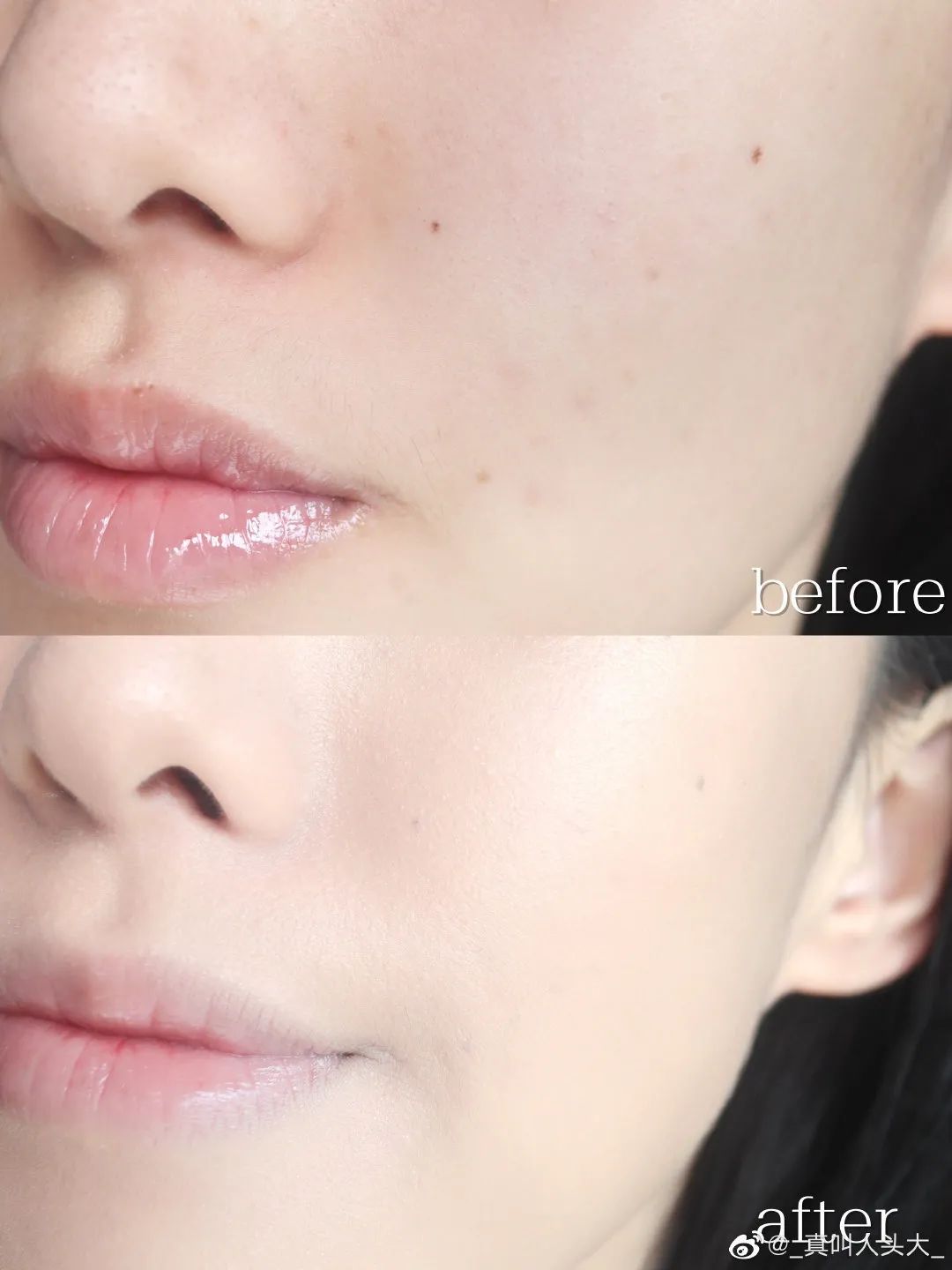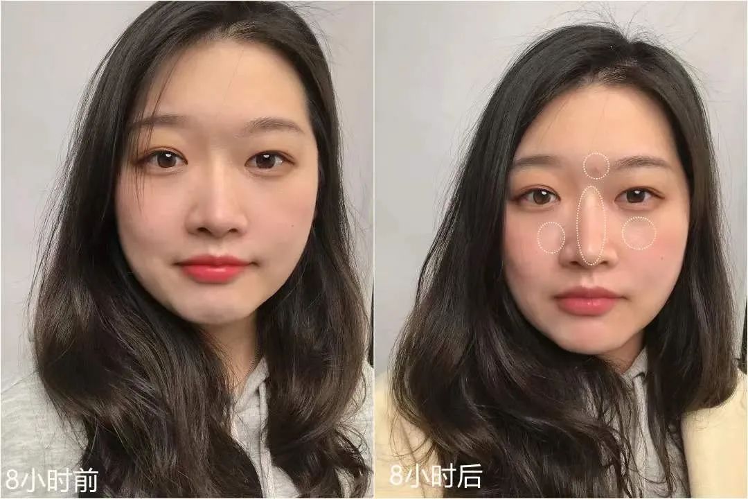 *左半脸用了散粉,对比右边出油情况,左脸干爽0油光