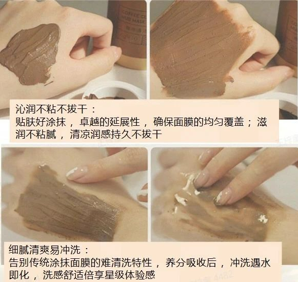 它的质地和普通的涂抹式面膜不同,是介于精华和面霜之间的咖啡慕斯质地。