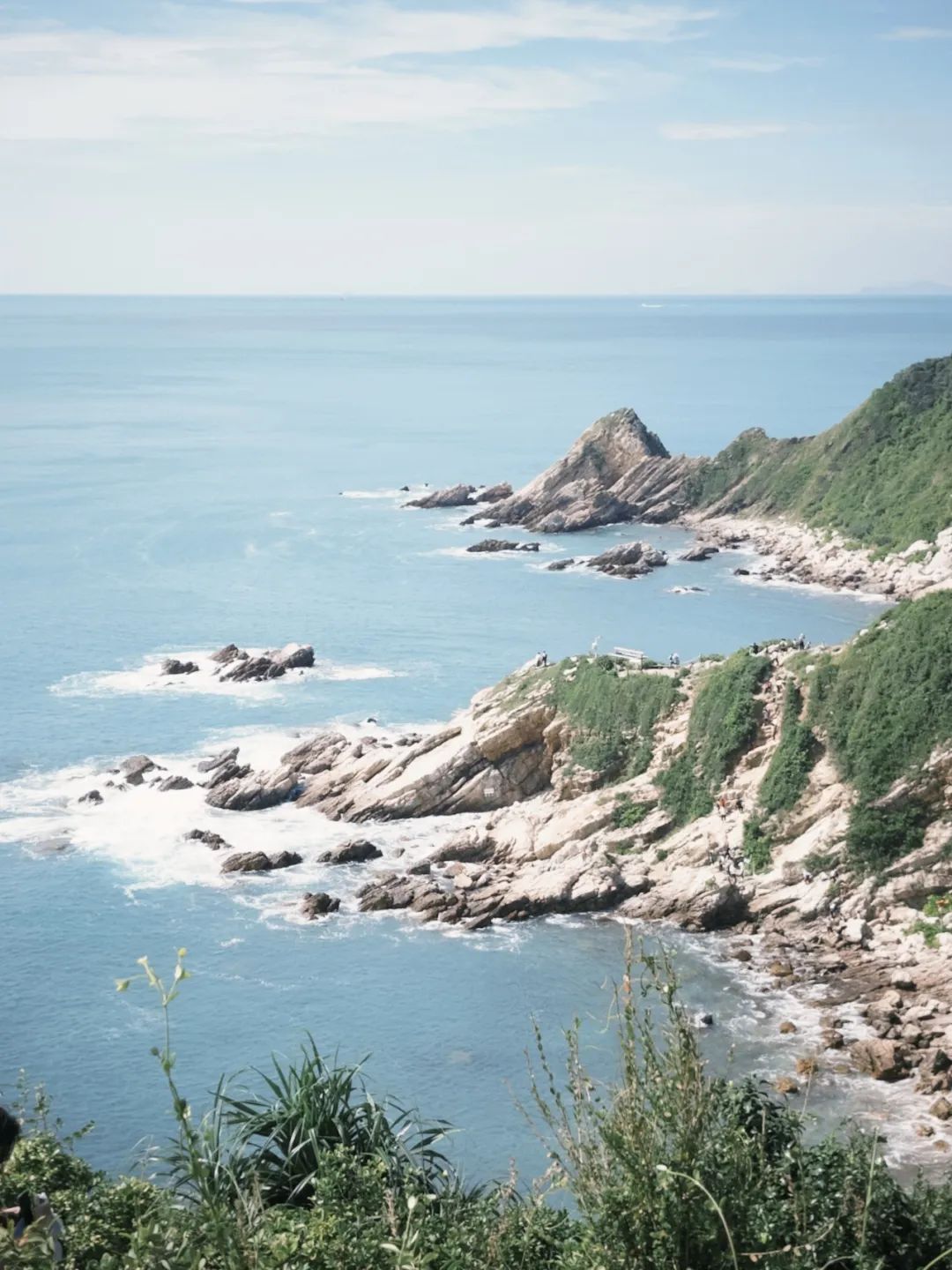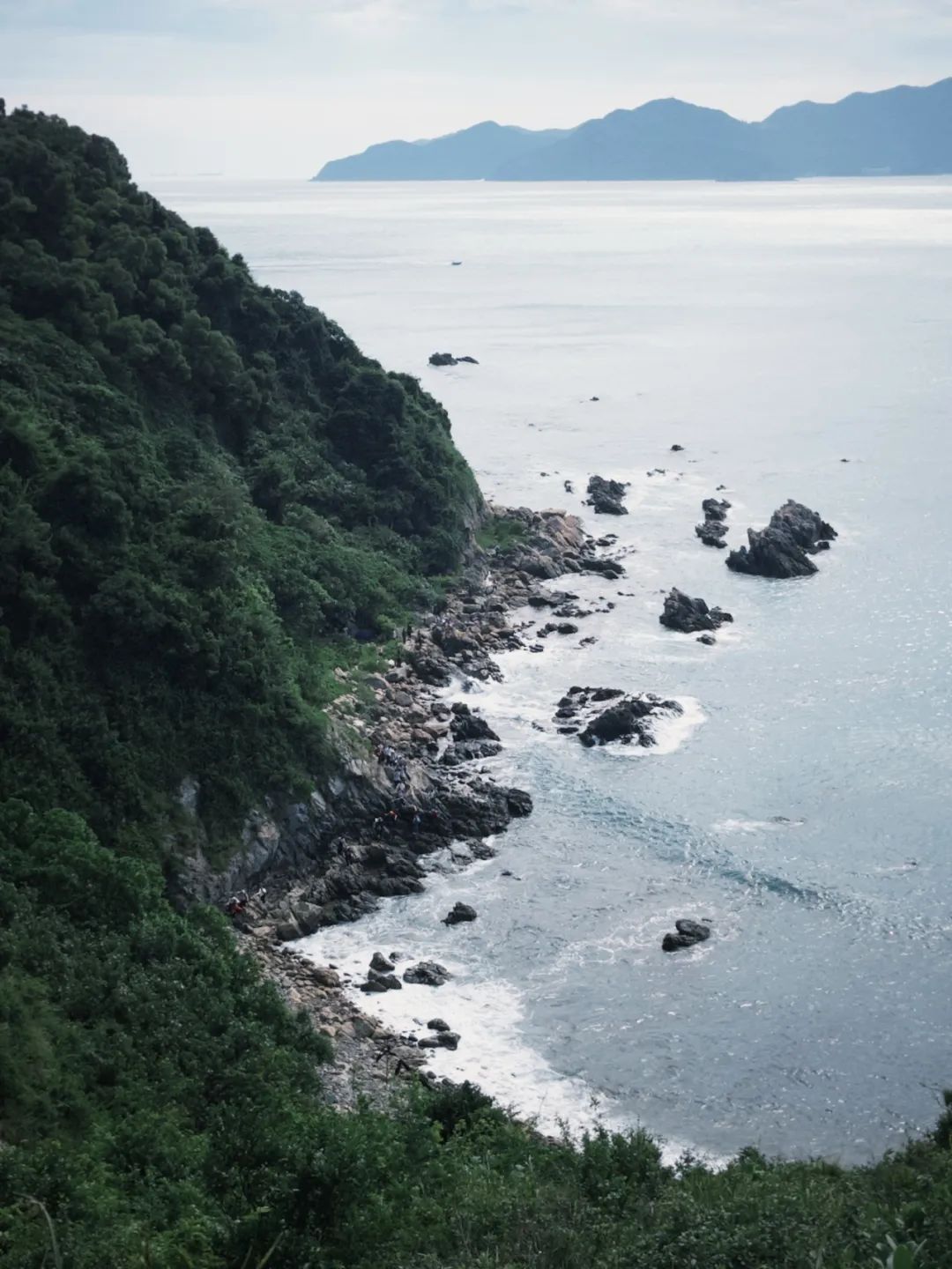 起点在东涌,先是走了一段普普通通的山林小径,和大部分的徒步线路并无区别,渐渐能听到浪花拍打海岸的声音,待到走出一处山坡转角,便看到一片茫茫大海,海天一色,绵延碧蓝,然海岸曲折,裸露的岩石如带,分割开了翠绿的山面和清蓝的海面,再走再爬再上再下,穿过山林小径、走过岸边礁石、爬上裸露岩壁,如此反复五六座山头,其中景色难以言语,踩在沙滩上看浪花翻涌,潮起如白丝,潮落似裂纹。