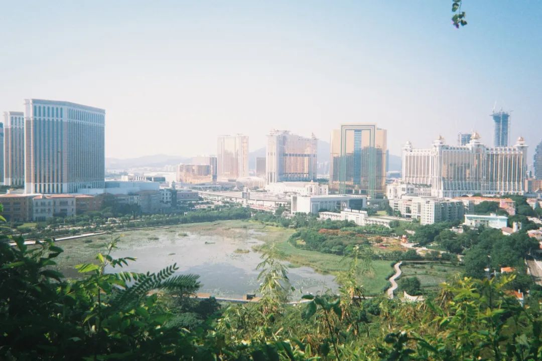 攀登的疲惫在到达山顶时被一扫而空——眼前豁然开朗,澳门半岛的轮廓如画卷般展开。微风带着海的味道扑面而来,阳光穿透薄雾,远处是澳门新葡京金灿灿的建筑。