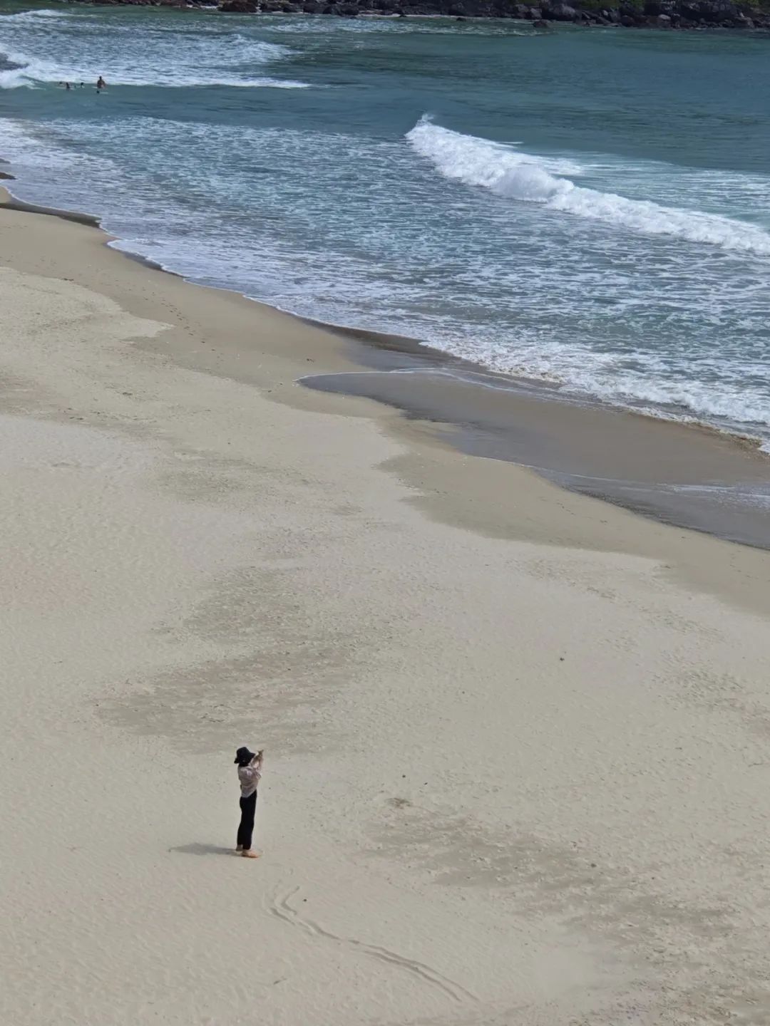 近看是海沙交相拍打,偶有三两船只停泊,浪潮起伏间听得一派宁静,远看是海天交融,唯有一线海面上缀着几颗货轮,天地之大,再无其他纷扰,仅眼前一片豁达景色。