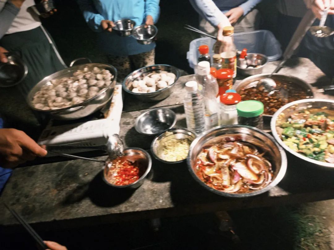 行程最好吃的两餐饭是在一座小岛上,我们搭乘快艇去岛上露营,晚饭是琳达姐准备的火锅,食材很多,随下随吃,大伙都站着等领队下食材,琳达姐和领队各管一锅,两锅双管齐下,这边熟了就端碗去这个锅,那边熟了就端碗去那个锅,下饭凉菜是一道凉拌牛肉,味道爽口,还没正式吃饭就刮走了大半,还有一盆自己拌的辣椒油,用来拌火锅食材最合适不过。