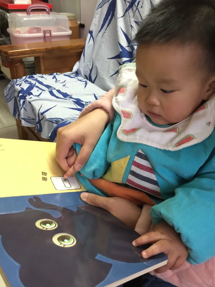 对家里的开关和灯特别感兴趣,每次开灯大人会模仿书里面说“啪嗒”灯开了,他就特别开心,说灯在哪,知道用手去指。